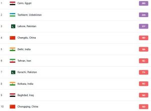 همچنین از این ۱۰ شهر ذکر شده، قاهره، تاشکند و لاهور در وضعیت بسیار ناسالم و بقیه شهرها نیز در وضعیت ناسالم قرار دارند.