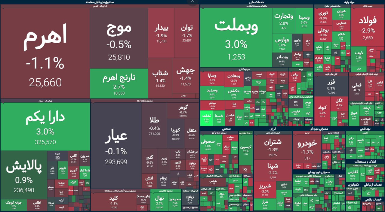 گفتنی است تابلو بورس اوراق بهادار تهران در روز جاری، حجم معاملات را ۳۴.۹ میلیارد برگه سهم و ارزش معاملات خرد (سهام، حق تقدم و صندوقهای سهامی) را ۱۲ هزار و ۸۱۱ میلیارد تومان نشان میدهد.