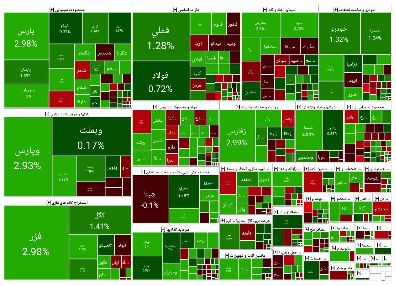 شاخص کل بورس امروز هفت هزار و ۶۸۵ واحد بالا رفت و با رشد ۰.۲۴ درصدی در ارتفاع سه میلیون و ۱۶۷ هزار و ۸۶۶ واحد قرار گرفت. شاخص هموزن نیز دو هزار و ۶۵۰ واحد بالا رفت و با افزایش ۰.۲۹ درصدی به سطح ۹۲۳ هزار و ۶۷۶ واحد رسید.