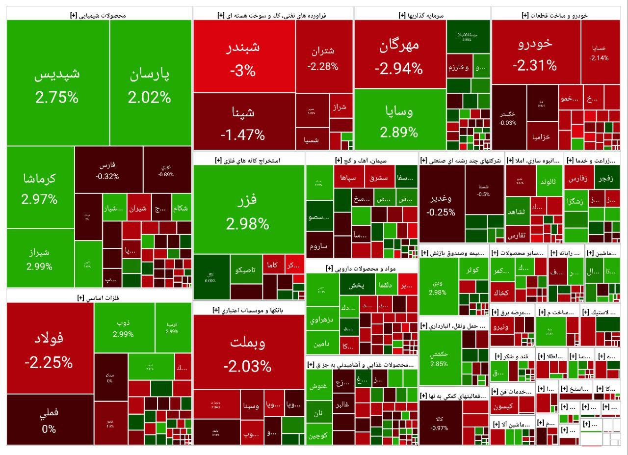 ۳۷ درصد بازار سبز پوش و ۲۵۲ نماد مثبت بودند ۶۳ درصد بازار سرخ پوش و ۴۶۶ نماد منفی بودند.