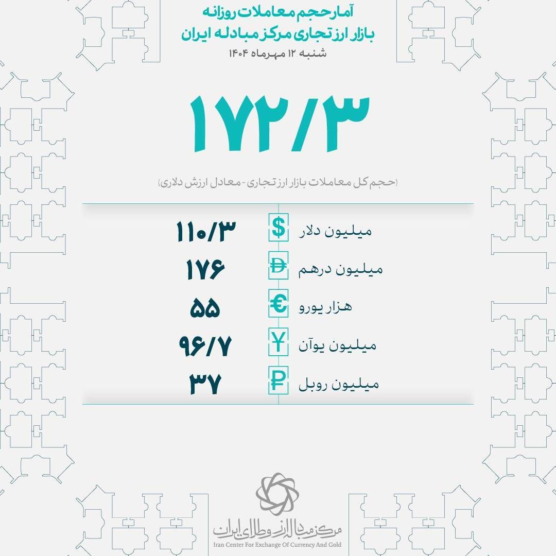 طی روز شنبه ۱۲ مهرماه ۱۴۰۴، حجم کل معاملات بازار ارز تجاری مرکز مبادله ایران به تفکیک نوع ارز، ۱۱۰.۳ میلیون دلار، ۱۷۶ میلیون درهم،۵۵ هزار یورو ،۹۶.۷ میلیون یوآن و ۳۷ میلیون روبل مورد دادوستد قرار گرفت؛ معادل ارزش دلاری این حجم معاملات ۱۷۲.۳ میلیون دلار است.