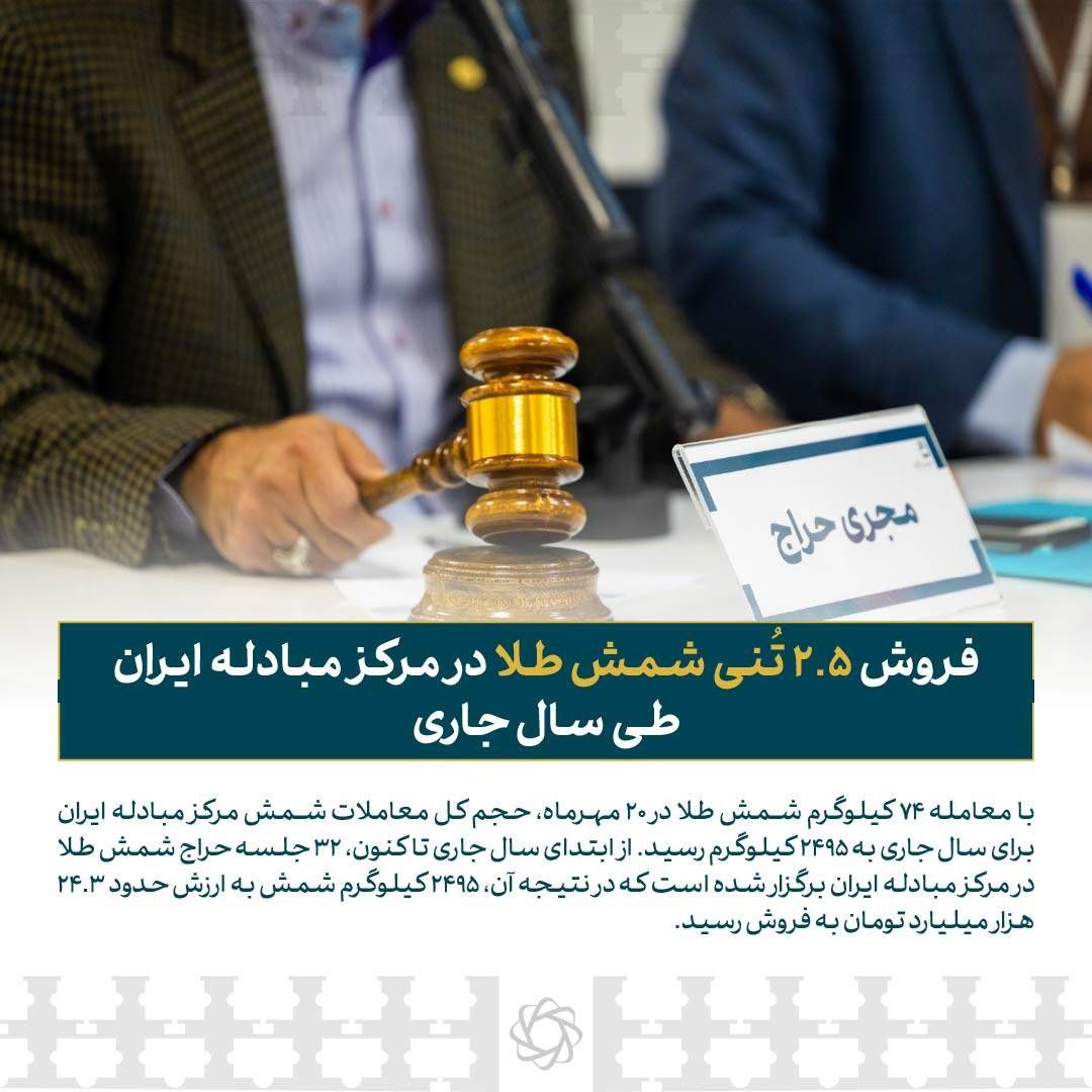 از ابتدای سال جاری تا کنون، ۳۲ جلسه حراج شمش طلا در مرکز مبادله ایران برگزار شده است که در نتیجه آن، ۲۴۹۵ کیلوگرم شمش به ارزش حدود ۲۴.۳ هزار میلیارد تومان به فروش رسید.