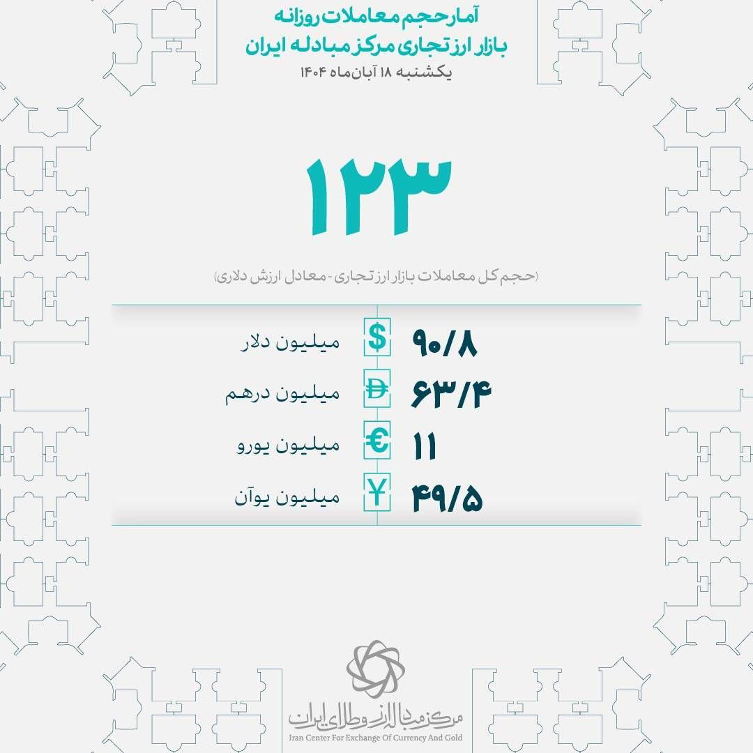 در جریان معاملات روز شنبه ۱۷ آبان ۱۴۰۴، ارزش دادوستدهای بازار ارز تجاری مرکز مبادله ایران به ۱۲۳.۶ میلیون دلار رسید.