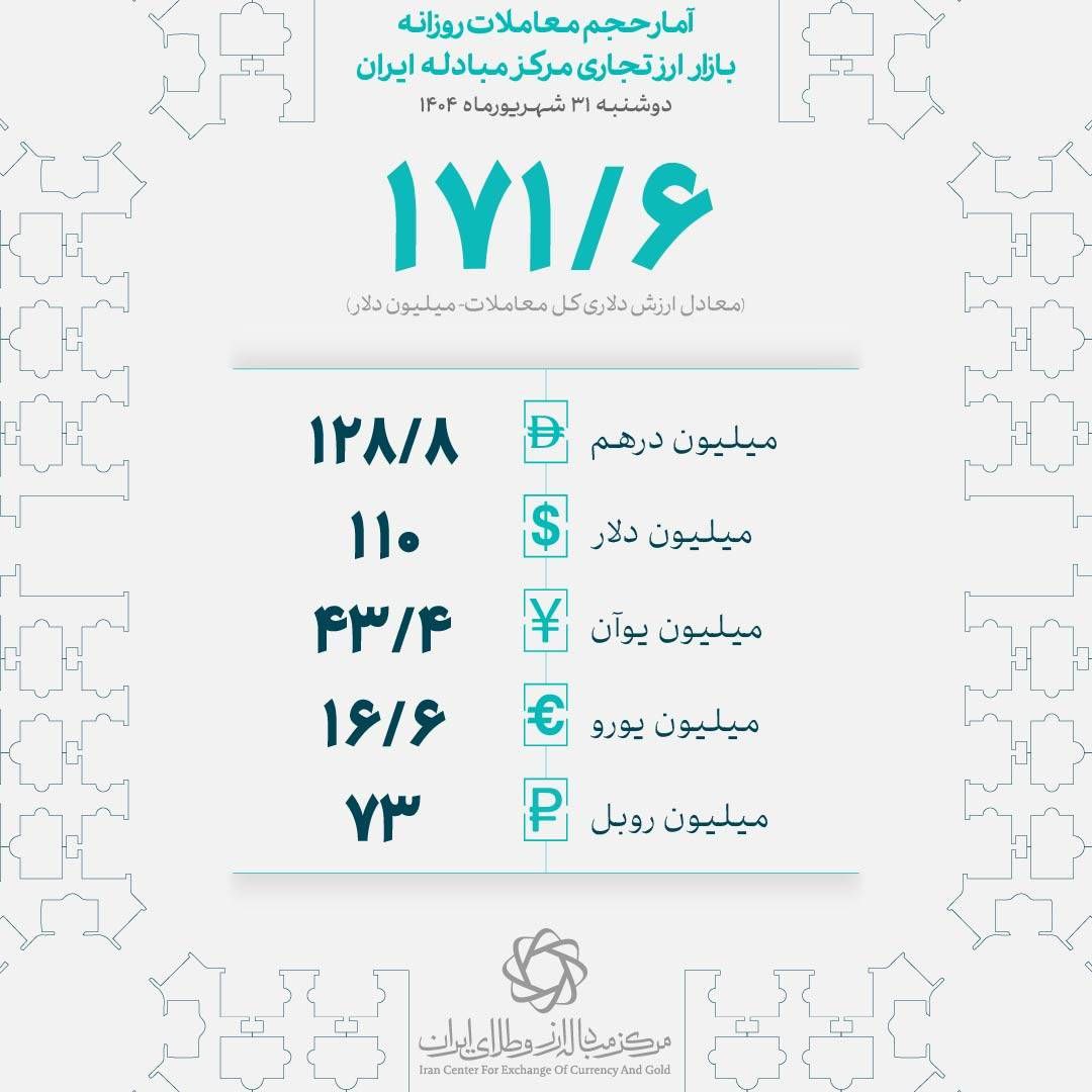 روز دوشنبه ۳۱ شهریورماه، بازرگانان ۱۷۱.۶ میلیون دلار در بازار ارز تجاری مرکز مبادله ایران مورد دادوستد قرار دادند.